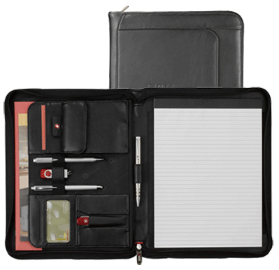 - Leather padfolio with zippered closure.